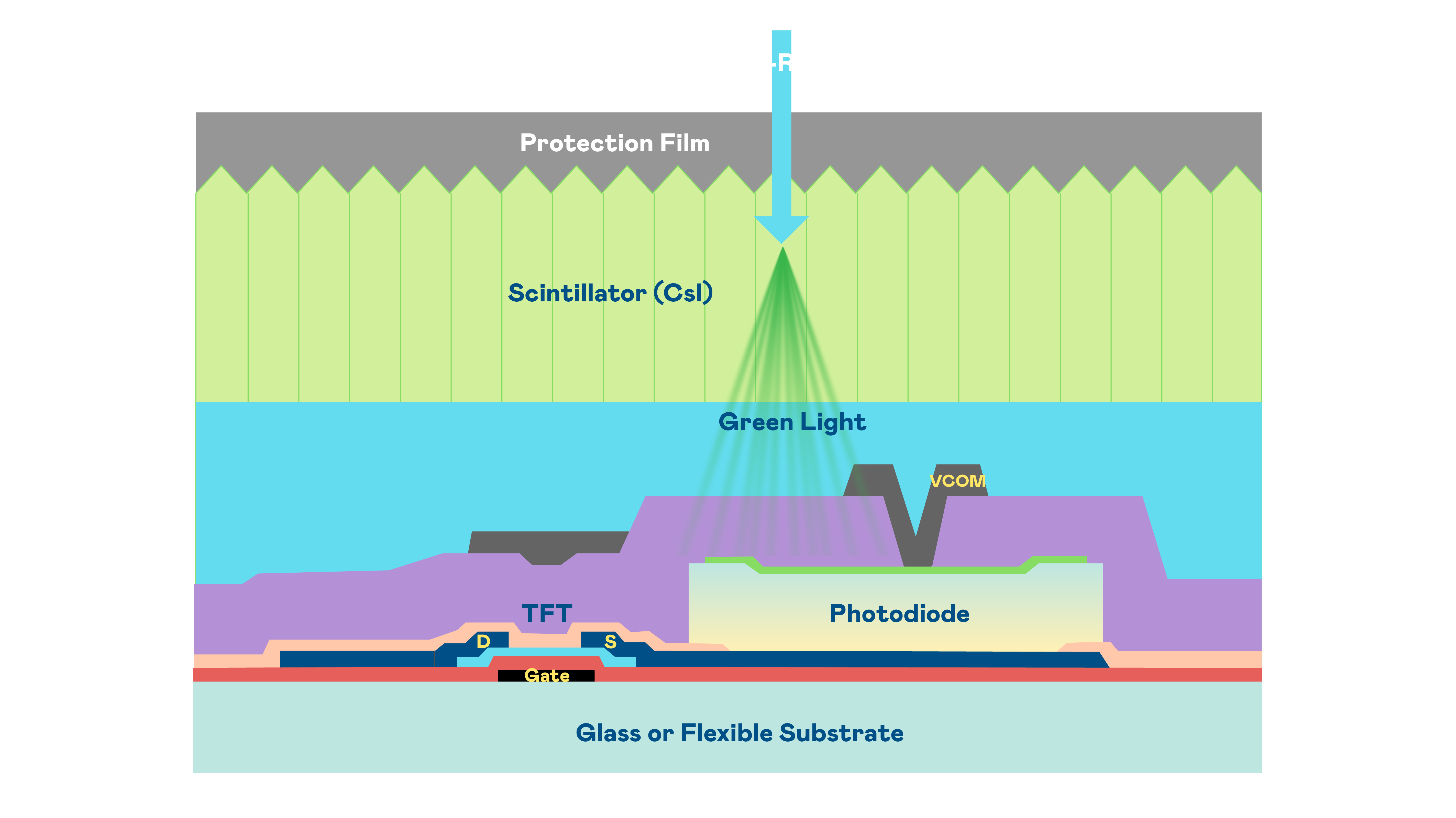 尊龙人生就是博首页的X光影像感测阵列使用薄膜电晶体 (TFT) 作为每个像素的读取开关,搭配光电二极体(Photodiode)的光电转换元件,用以感测X光影像讯号。